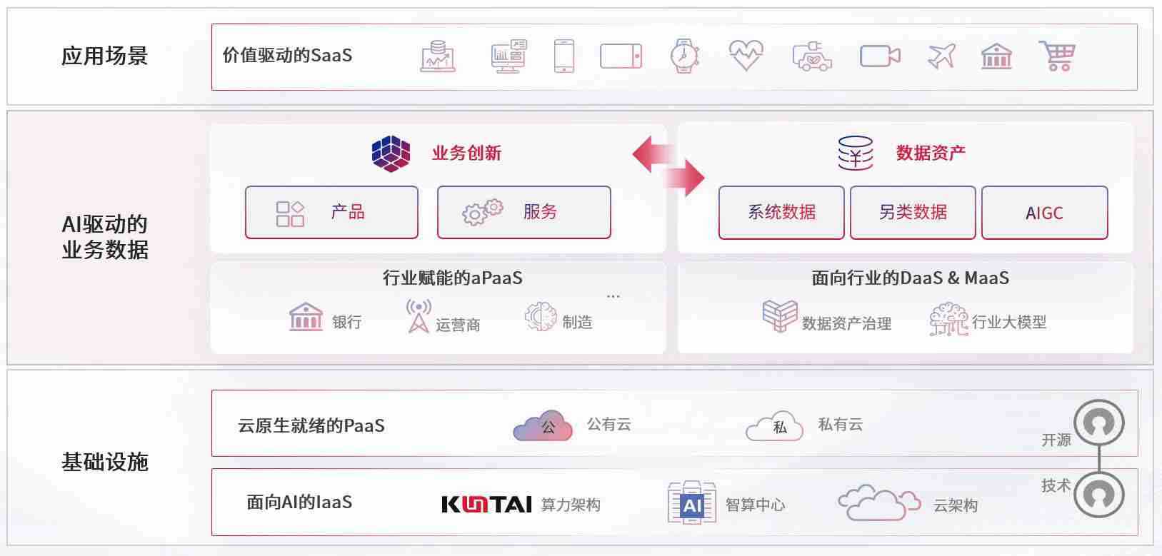 数字时代,,围绕企业数字化转型的关键要素,,尊龙旗舰厅数码开创性的提出数云融合战略和技术体系框架,,着力在云原生、、、数字原生、、、AI原生和信创产业上架构产品和服务能力,,,,为处在不同数字化转型阶段的快消零售、、、、汽车、、金融、、、医疗、、政企、、教育、、、运营商等行业客户提供泛在的敏捷IT能力和融合的数据驱动能力,,,,构建跨界融合创新的数字业务场景和新业务模式,,,助力企业级客户建立面向未来的核心能力和竞争优势,,,全面推动社会的数字化、、、、智能化转型升级。。