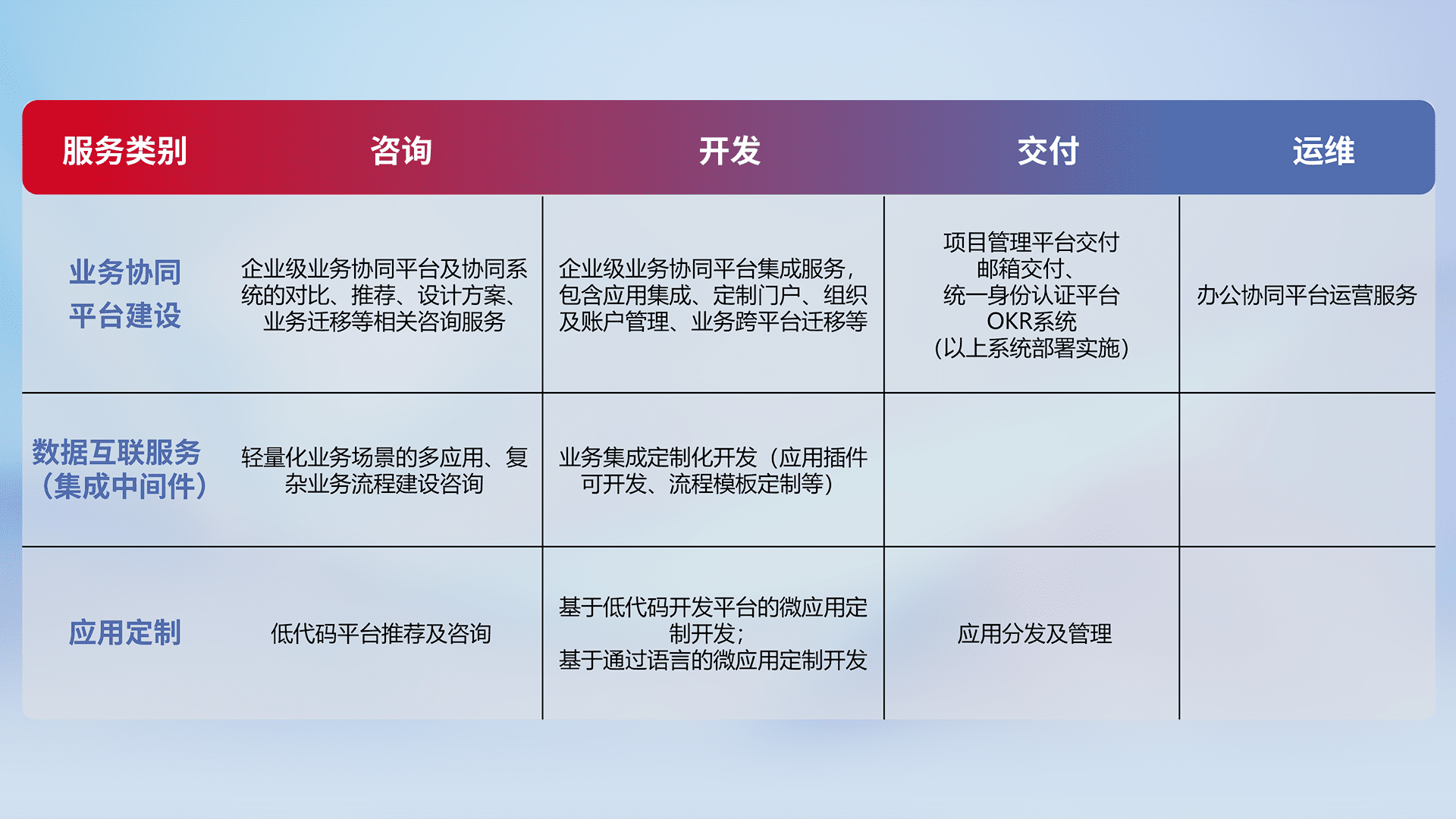针对钉钉、、企微、、、IDaas等平台级产品提供产品的规划、、、、方案、、交付、、、定制化开发等服务,,,实现如统一协同办公、、、智能客户服务、、、混合会议管理、、、智能数据查询、、、、等业务场景,,实现数字化转型。。。
